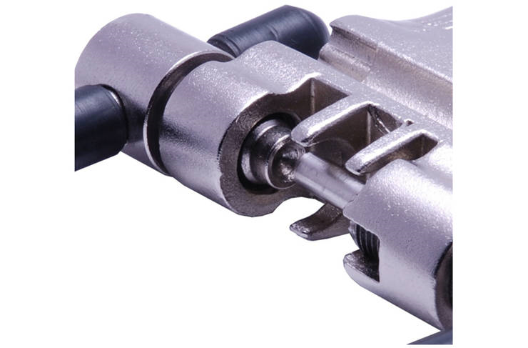 Pen verwijderaar is ingebouwd in de kettingpons body.