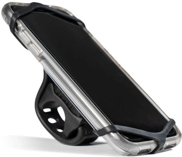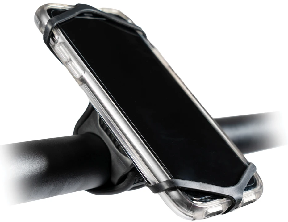 Zit strak om het stuur, zodat de telefoon er niet af valt.